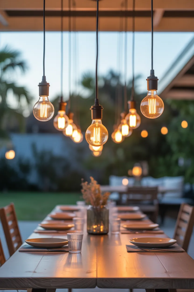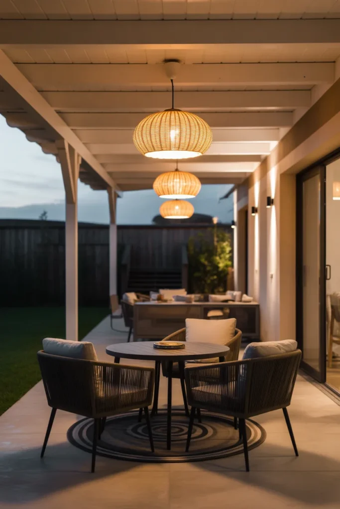 Pendant lights add elegance and focused illumination to covered patio areas. They help define specific zones while enhancing the overall design. The soft lighting creates a comfortable and inviting space for gatherings. This idea works especially well in structured outdoor setups.