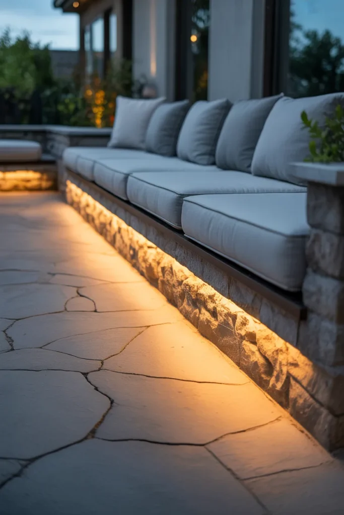 Hidden LED lights under seating create a floating visual effect that feels modern and sophisticated. The subtle glow enhances the structure without drawing too much attention to the light source. It adds both ambiance and functionality, especially for nighttime use. This idea works perfectly in sleek, contemporary patios.