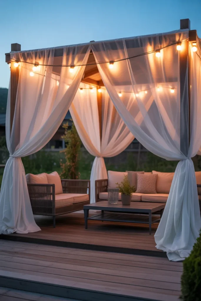 Canopy lighting combined with soft drapes creates a dreamy and luxurious patio setting. The diffused light through the fabric softens the overall glow. It feels intimate and perfect for relaxing or entertaining guests. This setup adds a romantic and elegant touch.