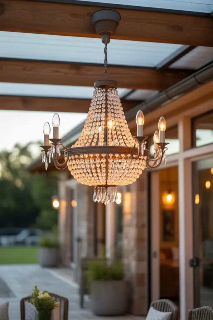 An outdoor chandelier acts as a stunning focal point for your patio. It instantly elevates the space and adds a sense of luxury. The soft lighting enhances the overall ambiance while drawing attention upward. This idea works beautifully in covered patios or pergolas.