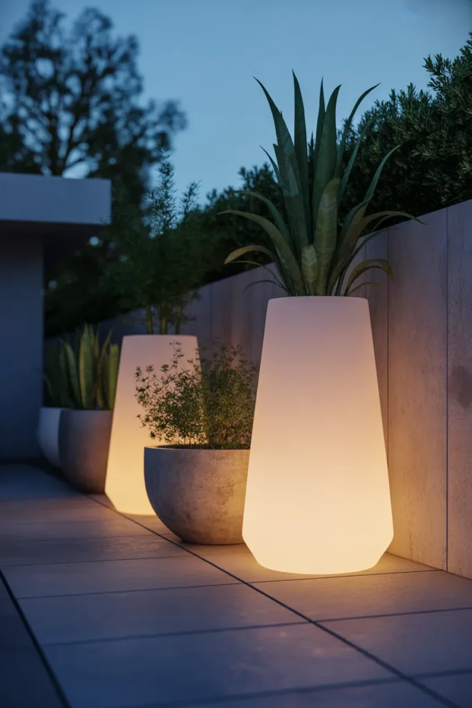 Glow-in-the-dark planters add a unique and modern lighting element to your patio. They provide subtle illumination while blending seamlessly with greenery. This creates a balanced mix of nature and design. It’s an unexpected yet stylish lighting idea.