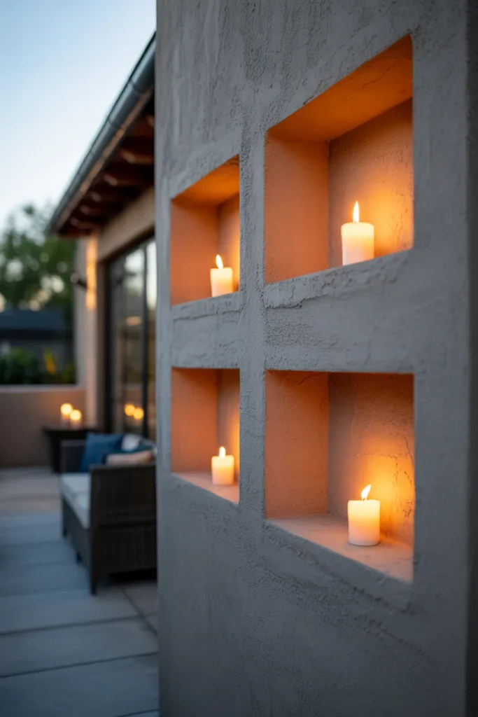 Wall niches with candles create a warm and intimate lighting effect. The recessed design adds depth and architectural interest to your patio. The flickering light enhances the cozy atmosphere. This idea is perfect for a relaxed and inviting outdoor space.