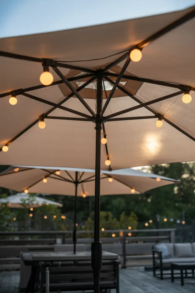 Umbrella string lights provide focused lighting for seating areas. They create a cozy circle of light perfect for dining or lounging. The design feels both functional and stylish. This idea is especially useful for compact patio setups.