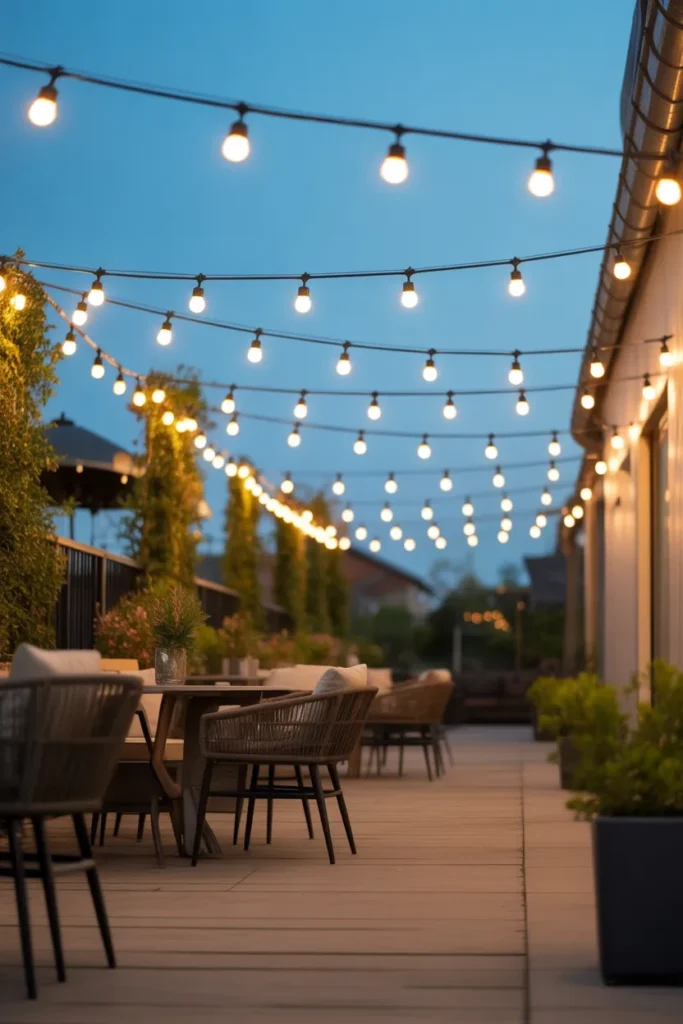 Zigzag bistro lights create a lively and visually dynamic patio atmosphere. The overhead pattern spreads light evenly across the space. It’s perfect for entertaining or casual outdoor dining. This setup feels both festive and functional.