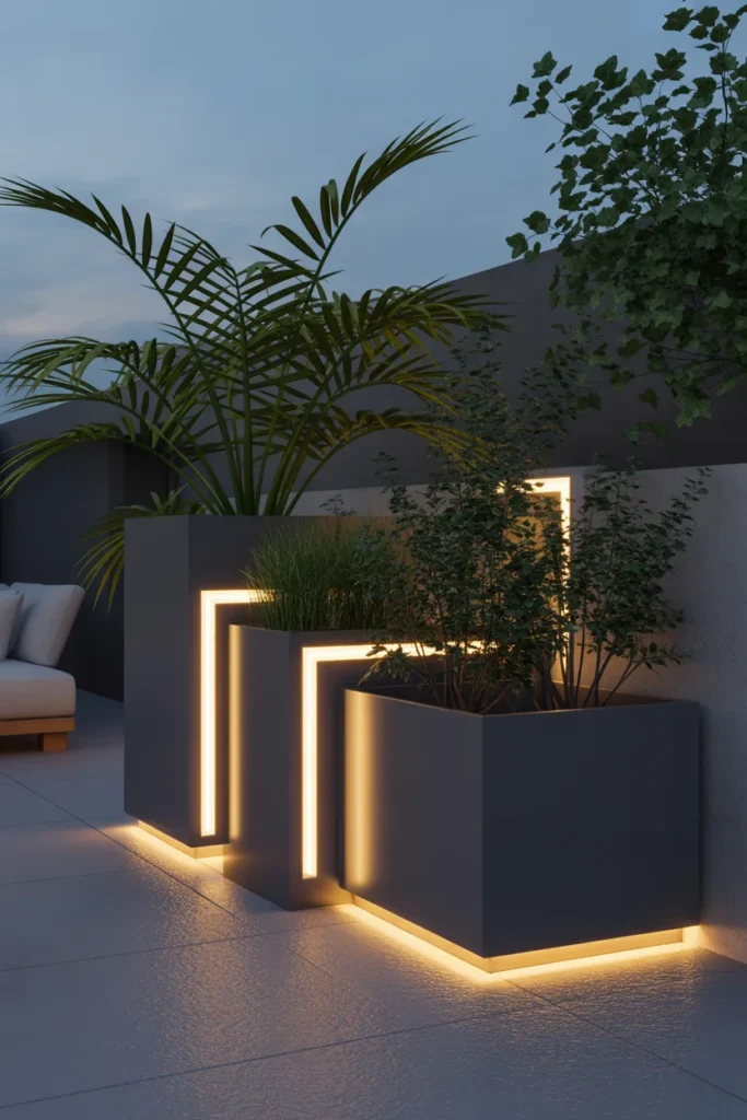 LED strips behind planters create a soft backlit effect that highlights greenery. The hidden lighting adds depth without being visually intrusive. It enhances the overall design while maintaining a clean look. This idea is great for modern patio aesthetics.