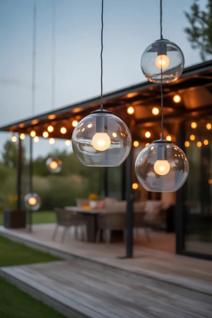 Hanging globe lights bring a soft and elegant glow to open patio spaces. Their round shape diffuses light evenly, creating a calm atmosphere. Varying the heights adds visual interest and dimension. This idea feels both modern and timeless.