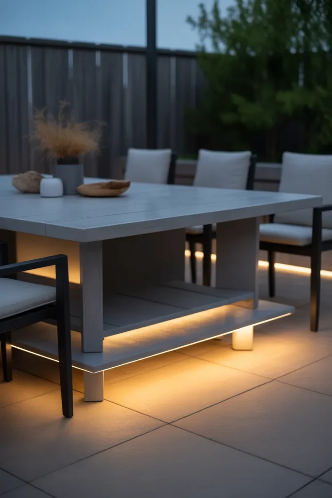 Under-table lighting adds a unique and unexpected layer of illumination. It creates a floating effect that enhances the overall ambiance. The subtle glow is perfect for relaxed evenings outdoors. This idea adds a modern twist to traditional patio setups.