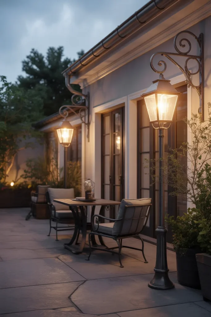 Vintage-style lamps bring a classic and timeless charm to your patio. Their warm glow creates a welcoming and nostalgic atmosphere. The detailed design adds character and elegance. This idea works beautifully in traditional outdoor spaces.