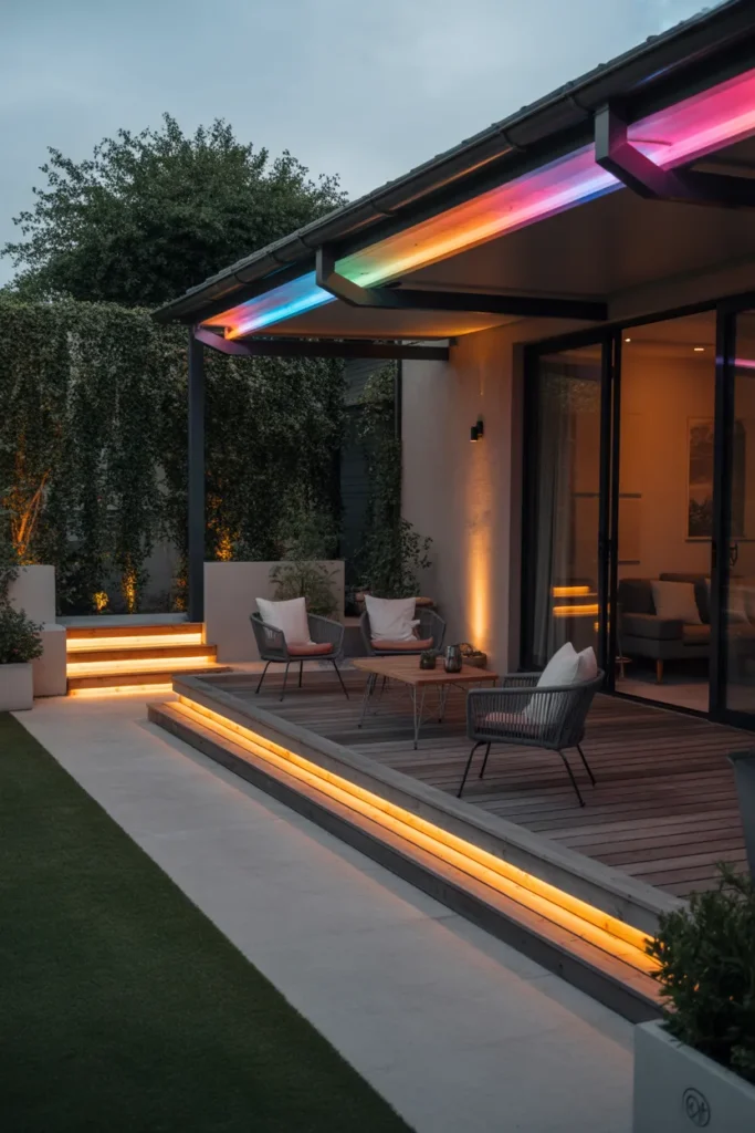 Color-changing LEDs allow you to customize your patio’s mood effortlessly. You can switch between soft warm tones or subtle colors depending on the occasion. It adds flexibility and creativity to your lighting design. This idea is perfect for entertaining or relaxing.