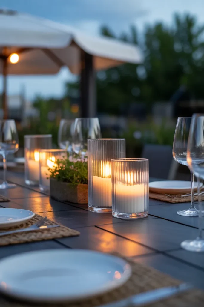 Candlelit centerpieces create an intimate and elegant dining experience on your patio. The soft flicker of light enhances the mood without overpowering the space. It feels warm, inviting, and timeless. This idea is perfect for quiet evenings or special occasions.