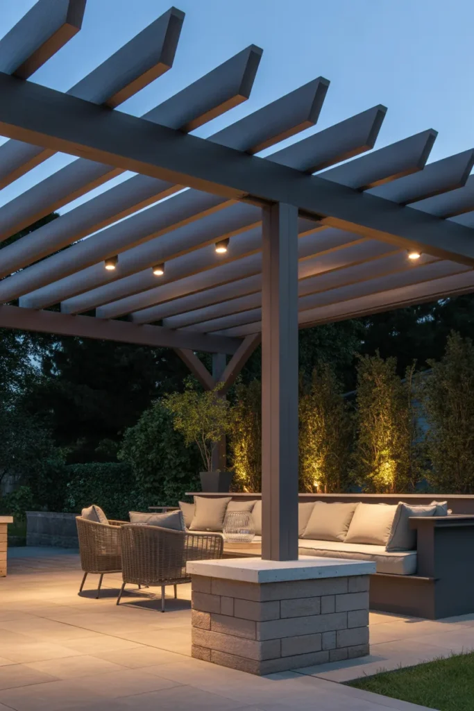 Integrated lighting within pergola beams offers a seamless and polished look. The hidden fixtures provide even illumination without visible clutter. It enhances the structure while maintaining a clean design. This idea is ideal for modern outdoor spaces.