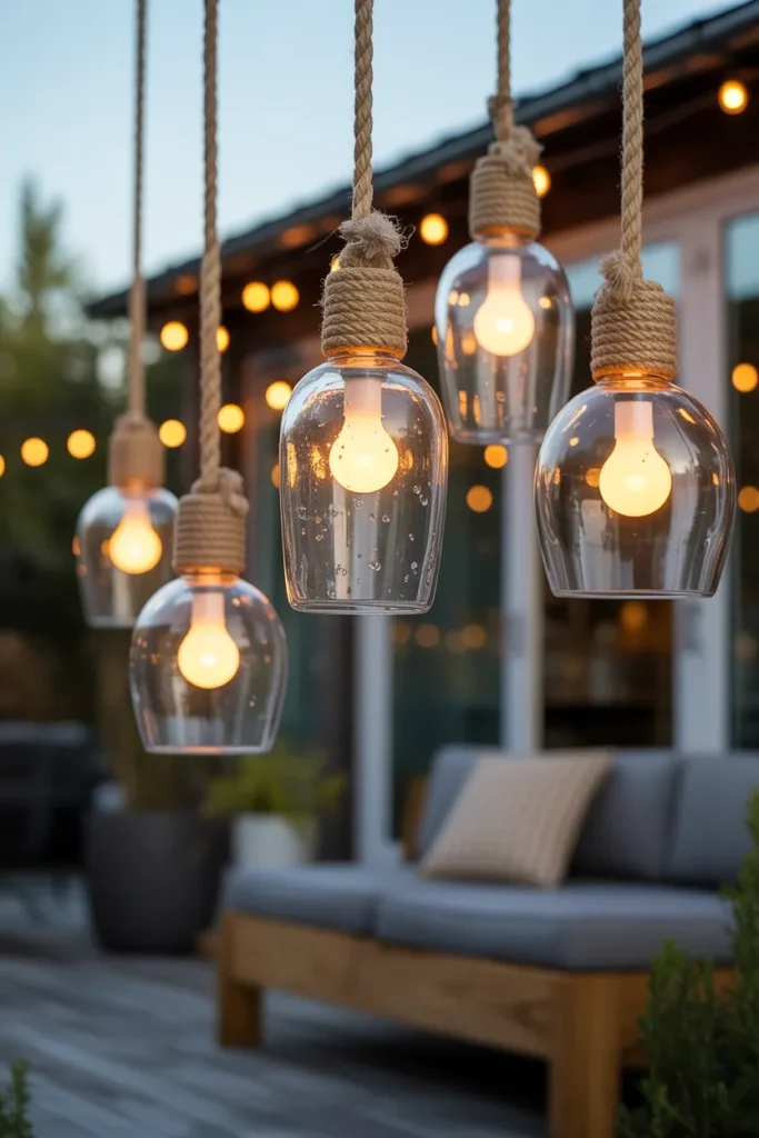 Glass bottle pendant lights add a creative and eco-friendly charm to your patio. The unique shapes and textures of the bottles create interesting light patterns. This idea feels artistic while still being functional. It’s perfect for a relaxed and stylish outdoor setup.