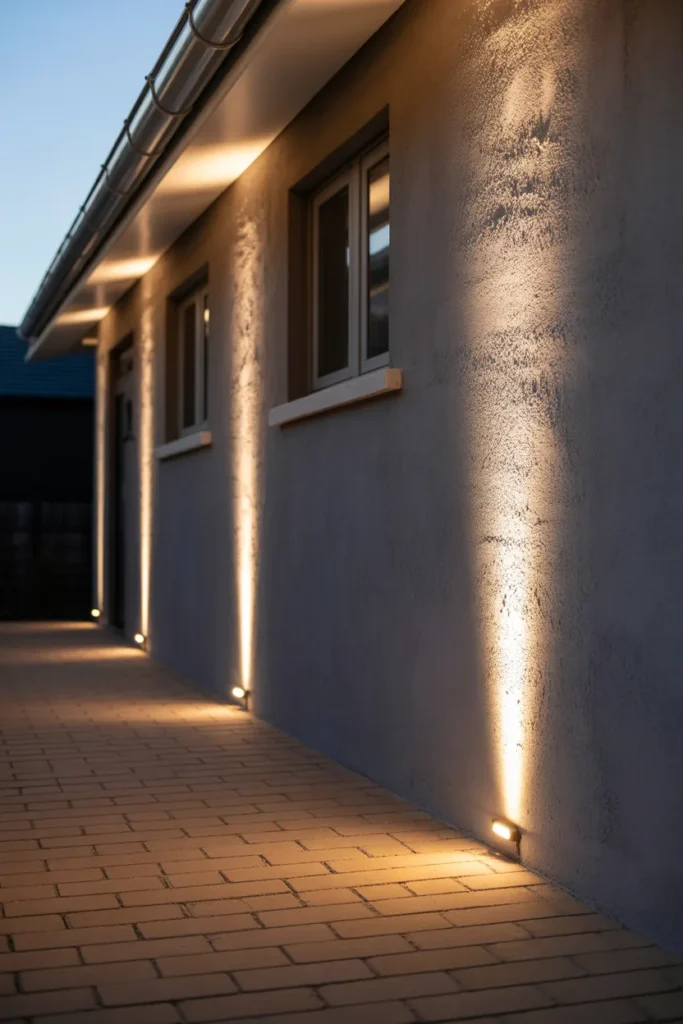 Uplighting on patio walls adds depth and sophistication to your space. The gradual light transition creates a calm and elegant atmosphere. It highlights textures and architectural details beautifully. This idea works well in both modern and classic patios.