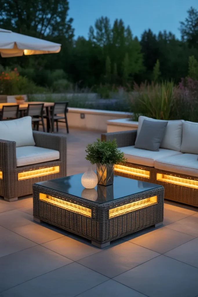 LED-lit furniture adds a futuristic and stylish touch to your patio. The soft glow enhances visibility while creating a unique ambiance. It blends functionality with modern design. This idea is perfect for contemporary outdoor spaces.