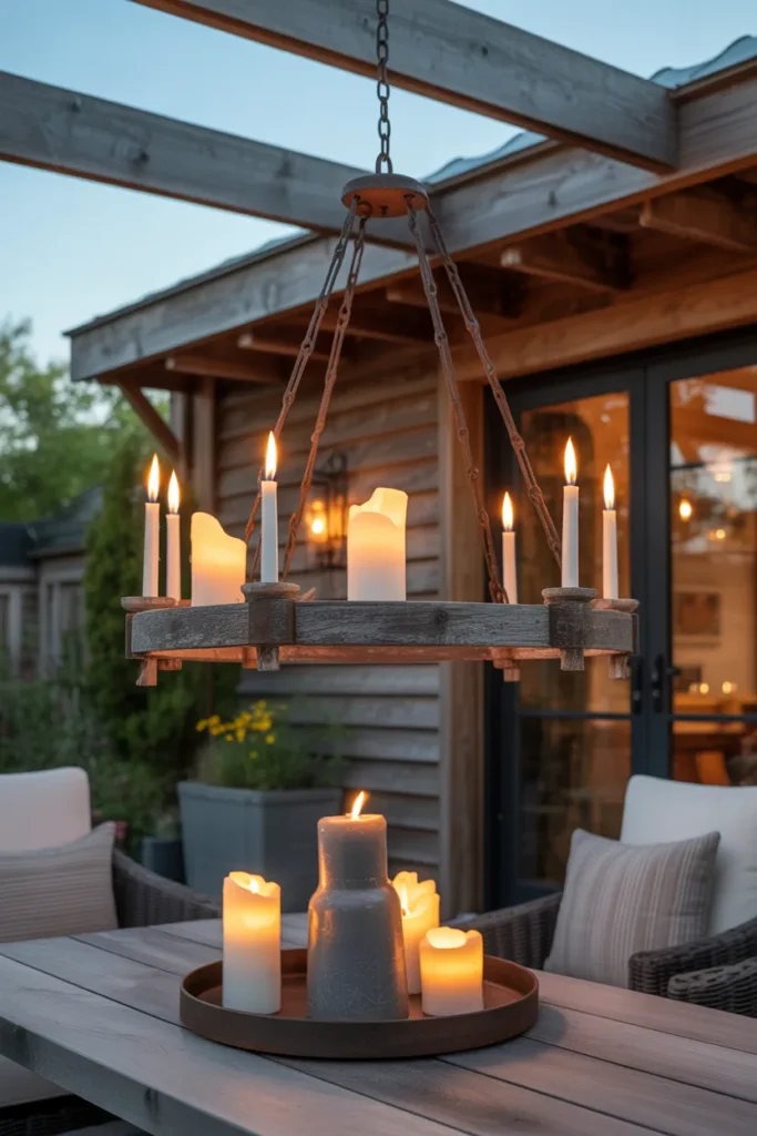 Rustic candle chandeliers bring warmth and character to your patio. The flickering flames create a cozy and inviting atmosphere. The natural materials add texture and charm. This idea is ideal for farmhouse or vintage-inspired spaces.