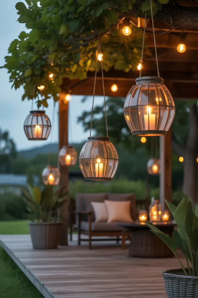 Hanging lanterns in trees create a magical and whimsical lighting effect. The soft glow filters through leaves, adding depth and movement. It feels natural and enchanting at the same time. This idea transforms your patio into a dreamy escape.
