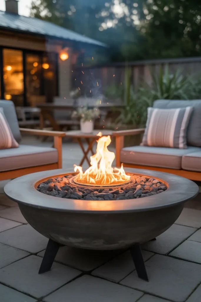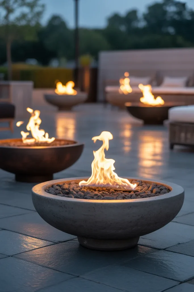 Fire bowls provide both warmth and ambient lighting for your patio. Their low placement creates a cozy and intimate setting. The natural flame adds movement and life to the space. This idea is perfect for creating a relaxing environment.