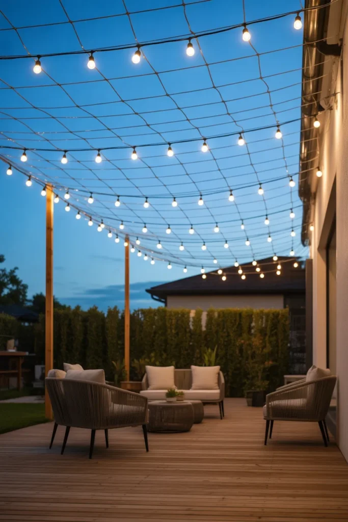 Net lighting overhead creates a fully illuminated canopy effect. It spreads light evenly across the patio for a bright yet cozy feel. This setup is perfect for entertaining larger groups. It feels festive while maintaining elegance.