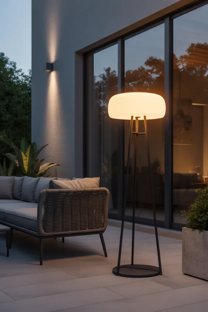 Outdoor floor lamps offer a simple and flexible lighting solution. They can be moved easily to suit different setups. The focused light adds comfort and functionality. This idea works well for minimalist patio designs.