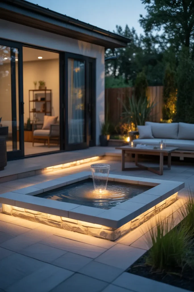Lighting around water features creates a calming and luxurious atmosphere. The reflections enhance the visual appeal of your patio. It adds movement and tranquility to the space. This idea is perfect for a peaceful outdoor retreat.