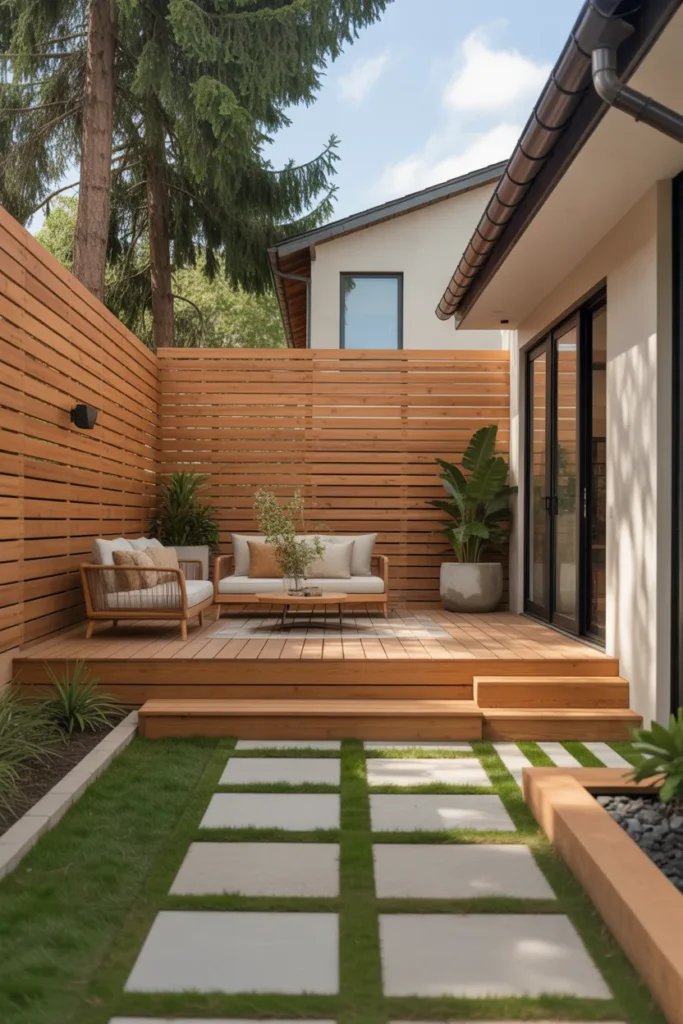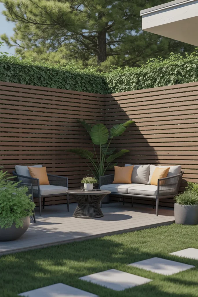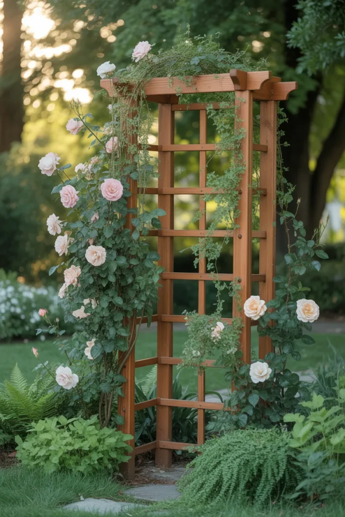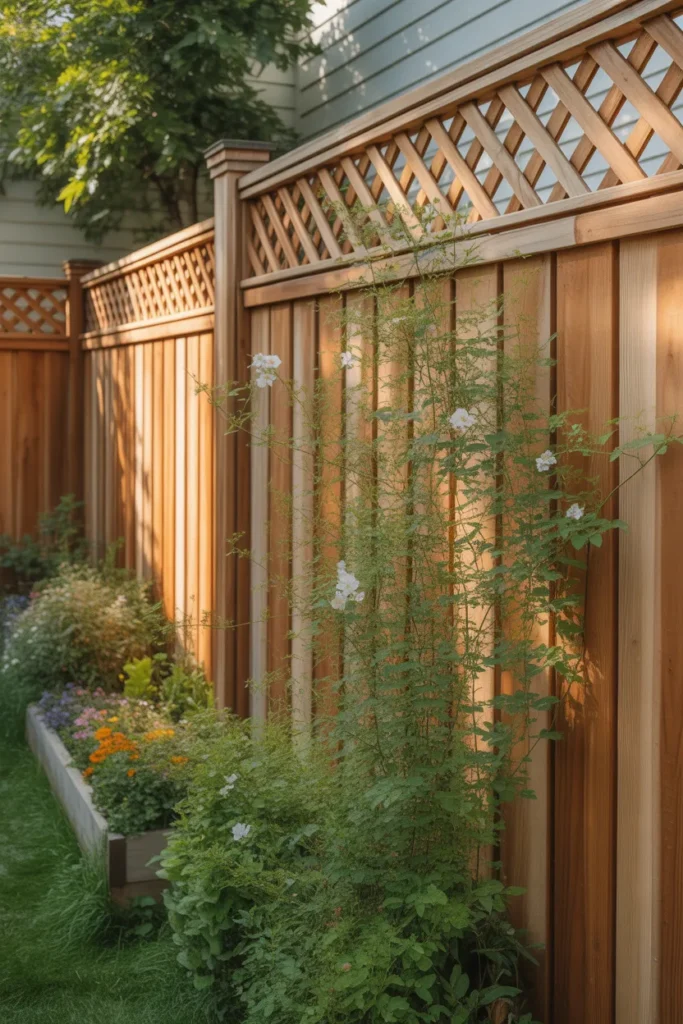 A tall trellis fence offers privacy while turning the backyard into a beautiful garden space. The wooden framework allows climbing plants to grow and form a natural privacy wall. Over time, flowers and greenery fill the gaps and create a lush outdoor atmosphere. This idea is perfect for people who want privacy while maintaining a soft, garden-inspired design.