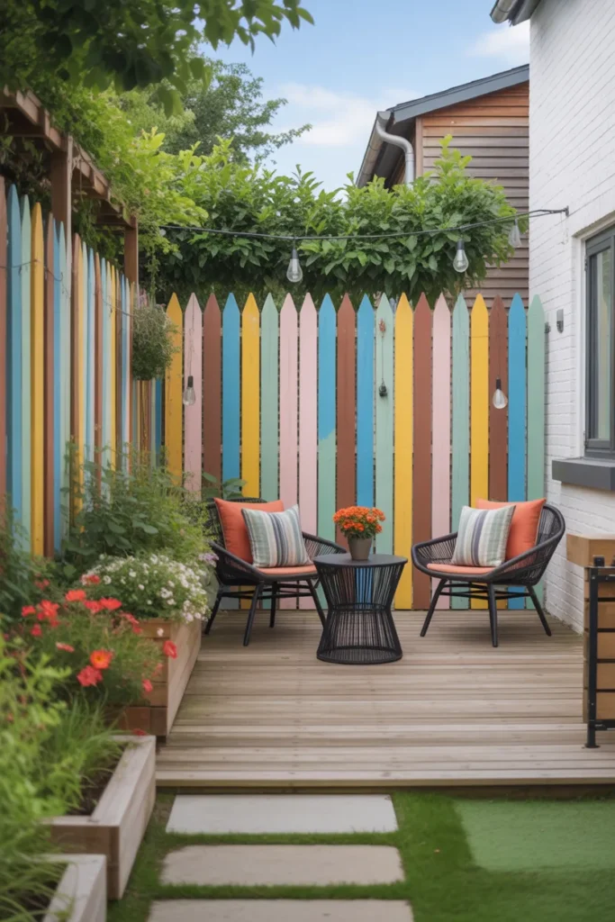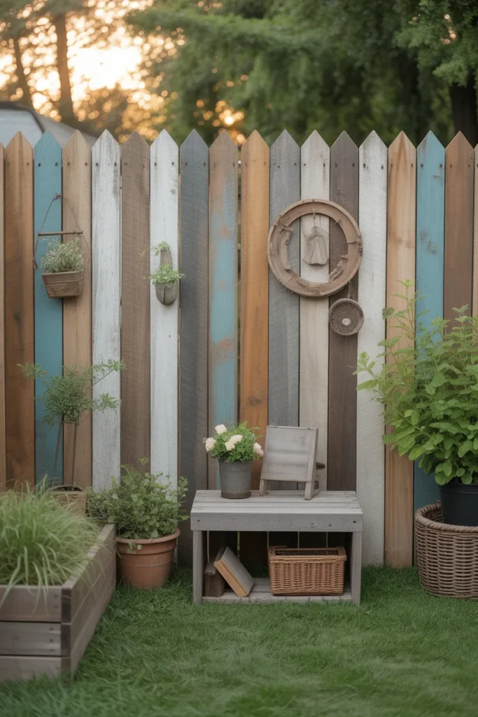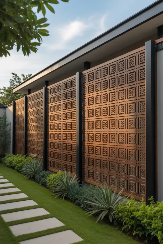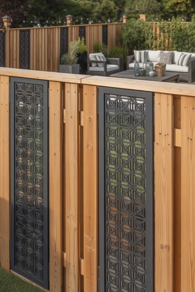 Decorative panels can turn a simple fence into an artistic backyard feature. Metal or carved wood inserts add texture and pattern without sacrificing privacy. When sunlight passes through the designs, it creates beautiful shadows across the yard. This idea is perfect for homeowners who want both privacy and standout style.
