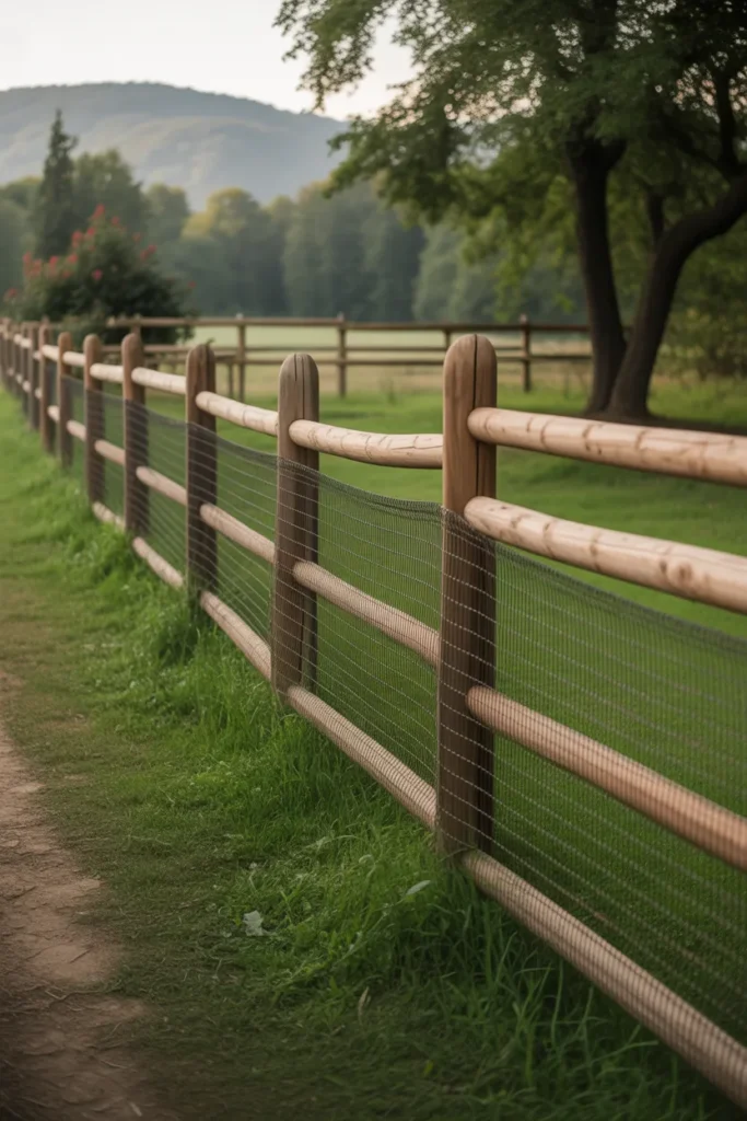 A split rail fence with added privacy mesh offers a perfect mix of rustic charm and practical coverage. The wooden rails give the yard a farmhouse-style look while the mesh lining blocks unwanted views. This design is ideal for larger yards where a traditional fence might feel too heavy. Many homeowners enjoy how it blends naturally with gardens and open landscapes.
