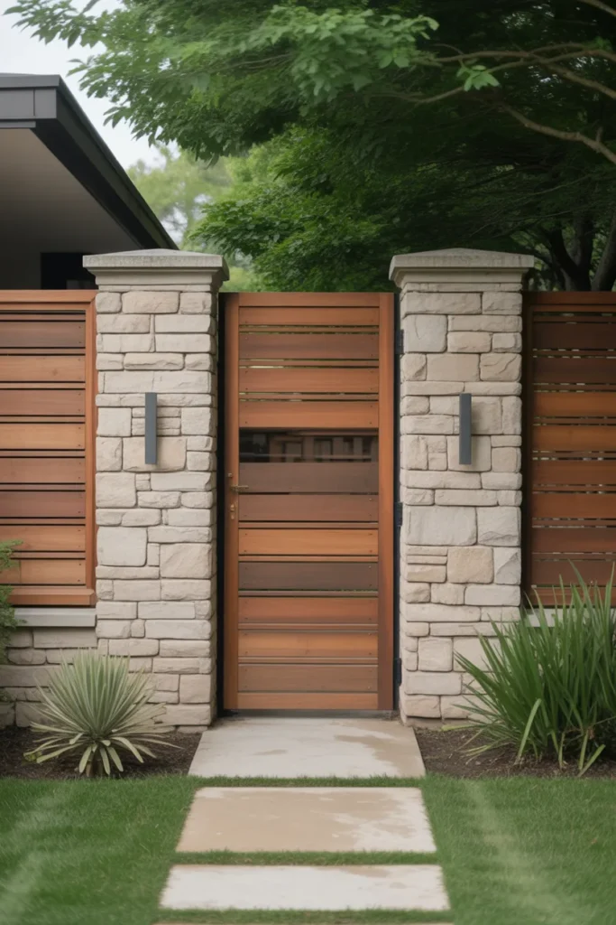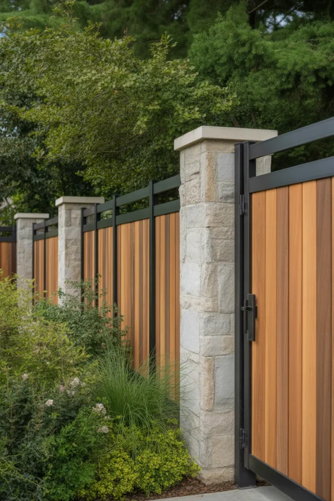 Stone and wood combinations create a fence that feels both sturdy and luxurious. The stone pillars provide strong structural support while the wooden panels soften the overall look. This design often increases curb appeal because it looks high-end and timeless. Many modern homes use this style to balance natural textures with durable materials.