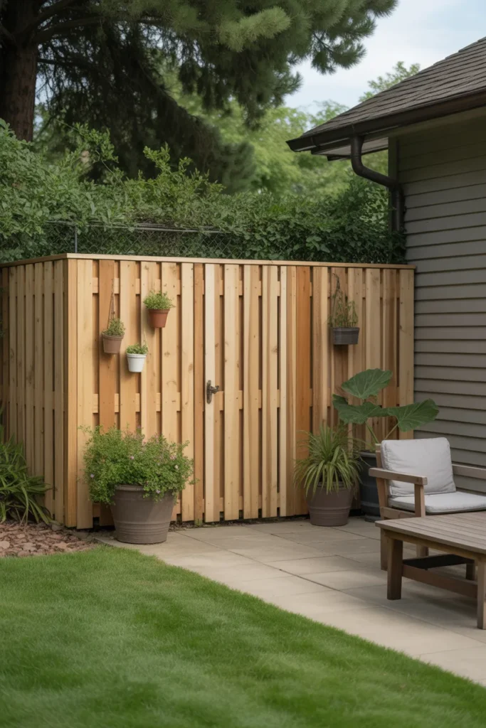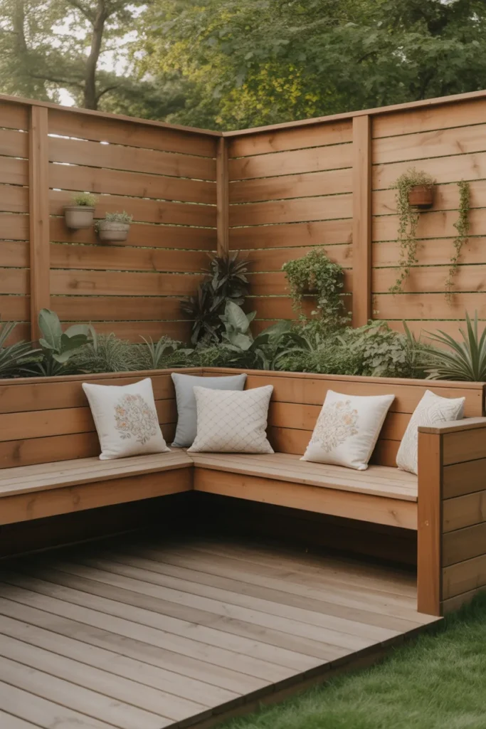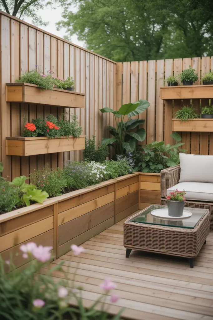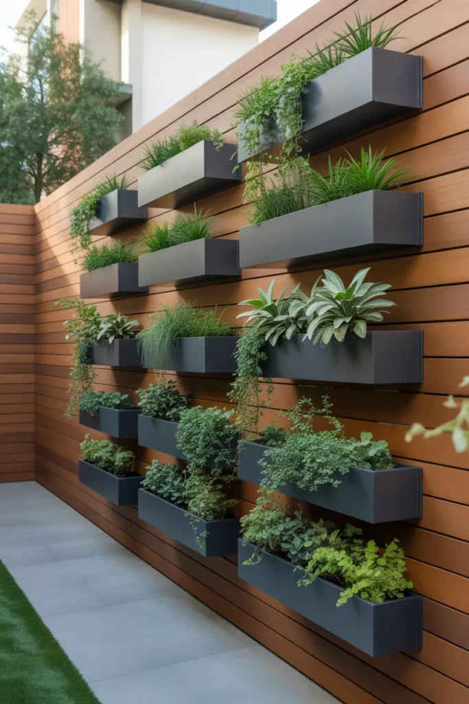 Vertical garden fences combine privacy with beautiful greenery. The fence panels include planters where herbs, flowers, or decorative plants can grow. This transforms a simple fence into a living wall that enhances the backyard environment. It is a creative solution for people who want privacy while adding life to their outdoor space.