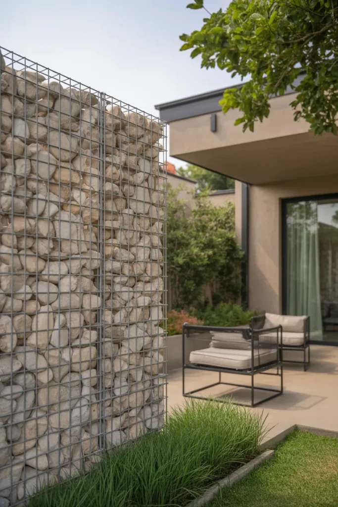 Gabion fences use metal cages filled with stones to create a strong and unique privacy barrier. The natural rock texture adds a bold visual statement to the backyard. This design is extremely durable and can handle harsh weather conditions easily. Many homeowners love how it blends modern architecture with natural materials.