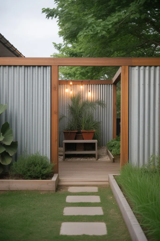 Corrugated metal fences are trending for their bold and industrial appearance. When paired with wooden frames, the design feels balanced and visually appealing. The metal panels provide excellent coverage while still reflecting light around the yard. This style works especially well in modern farmhouse or rustic backyard settings.