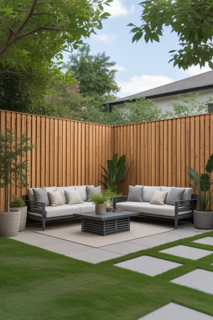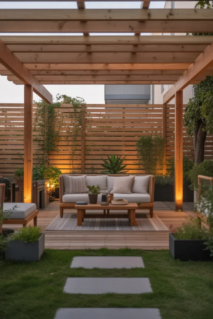 Pergola-style fencing combines privacy walls with overhead beams that add depth and style. This structure creates a cozy outdoor environment that feels like an extension of the home. Many people decorate the beams with lights or climbing plants for extra charm. The result is a backyard space that feels both private and inviting.