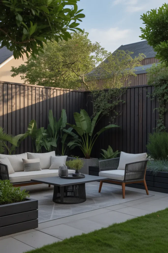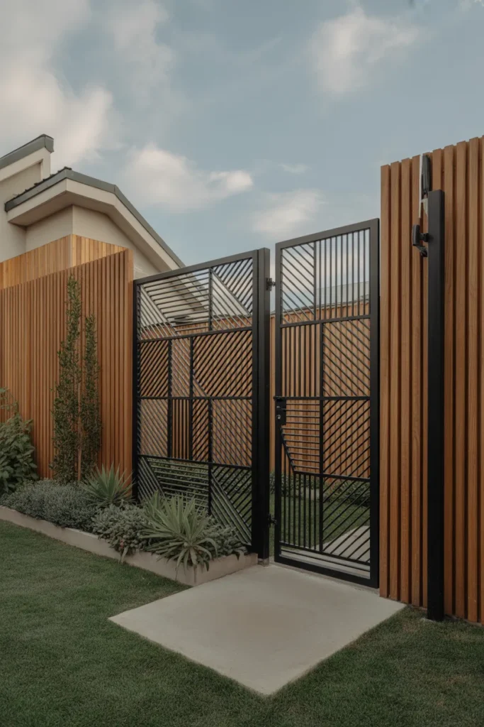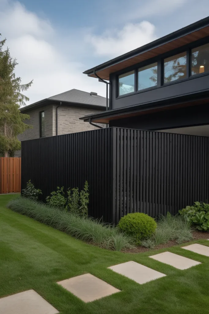 Black metal fences are becoming a bold design trend for modern homes. The dark finish adds contrast against greenery and creates a sophisticated outdoor atmosphere. Many designs include closely spaced metal panels that provide privacy without looking bulky. This style pairs beautifully with modern architecture and minimalist landscaping.
