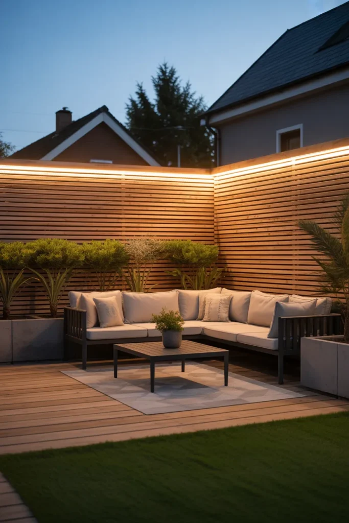 Adding lighting to a slatted fence can completely transform the backyard atmosphere. LED strips or small wall lights create a soft glow that highlights the structure at night. This design makes outdoor gatherings feel cozy and inviting. It also improves visibility and safety while maintaining a modern aesthetic.