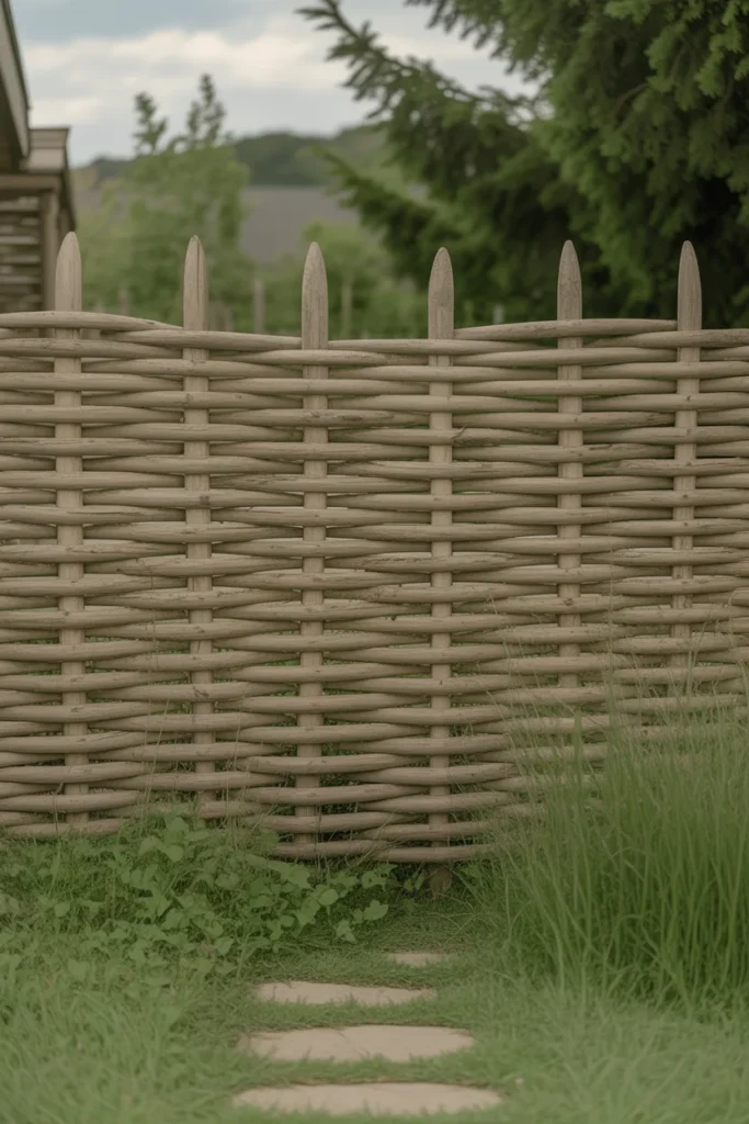 Woven wood fences create a stunning handcrafted appearance. Thin wooden boards are interlaced to form a pattern that feels both artistic and functional. The design allows slight airflow while still maintaining privacy. It also adds a warm and organic texture to the entire backyard landscape.