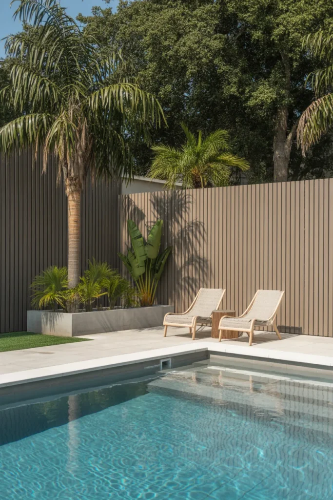 A poolside privacy fence helps create a relaxing and secluded outdoor retreat. Solid panels block outside views while making the pool area feel like a private resort. Many homeowners combine the fence with landscaping or lighting for a luxurious atmosphere. The result is a peaceful space perfect for relaxing or entertaining guests.
