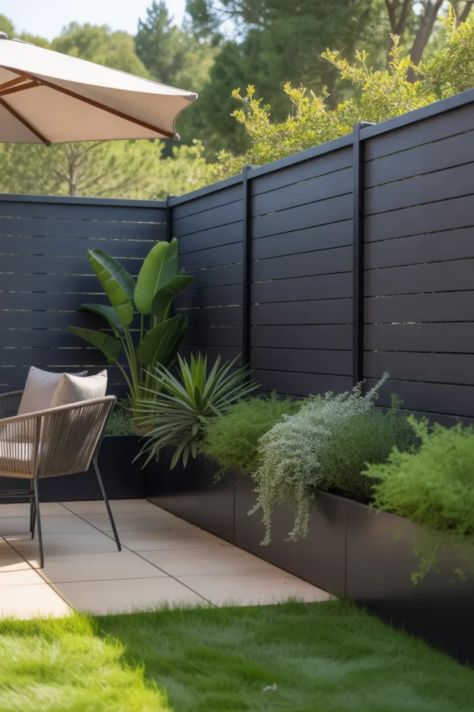 A fence with built-in planter boxes adds both privacy and decorative greenery to the yard. The integrated planters allow homeowners to grow flowers, herbs, or small shrubs directly along the fence line. This idea helps soften the appearance of solid fencing while creating a vibrant outdoor environment. It also turns the fence into a beautiful focal point of the garden.
