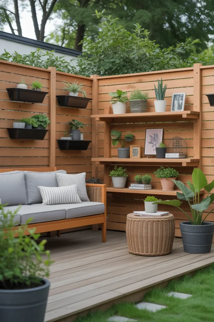 Adding shelves to a privacy fence turns it into a functional outdoor feature. The small shelves can hold potted plants, lanterns, or decorative accessories that enhance the backyard atmosphere. This design helps personalize the outdoor space while keeping the fence visually interesting. It is a creative way to combine storage and decoration in one simple upgrade.