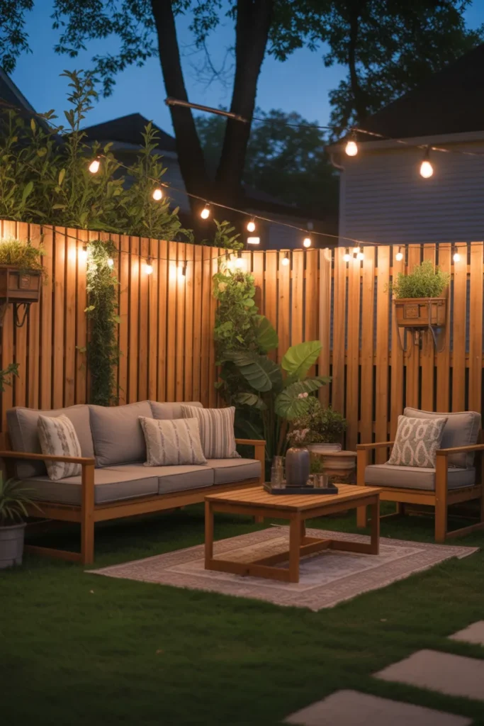 Hanging lights along a privacy fence instantly make the backyard feel warm and inviting. Soft string lights create a relaxing atmosphere perfect for evening gatherings or quiet nights outside. The fence acts as the perfect structure to support lighting across the space. This simple addition can transform a basic yard into a charming outdoor retreat.