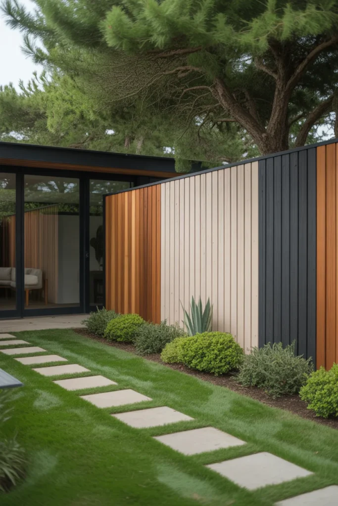 A two-tone fence uses contrasting colors to create a visually striking backyard feature. For example, combining natural wood with black or white panels can produce a modern and balanced design. The contrast adds depth and makes the fence stand out in the landscape. This style is perfect for homeowners who want a bold yet elegant upgrade.
