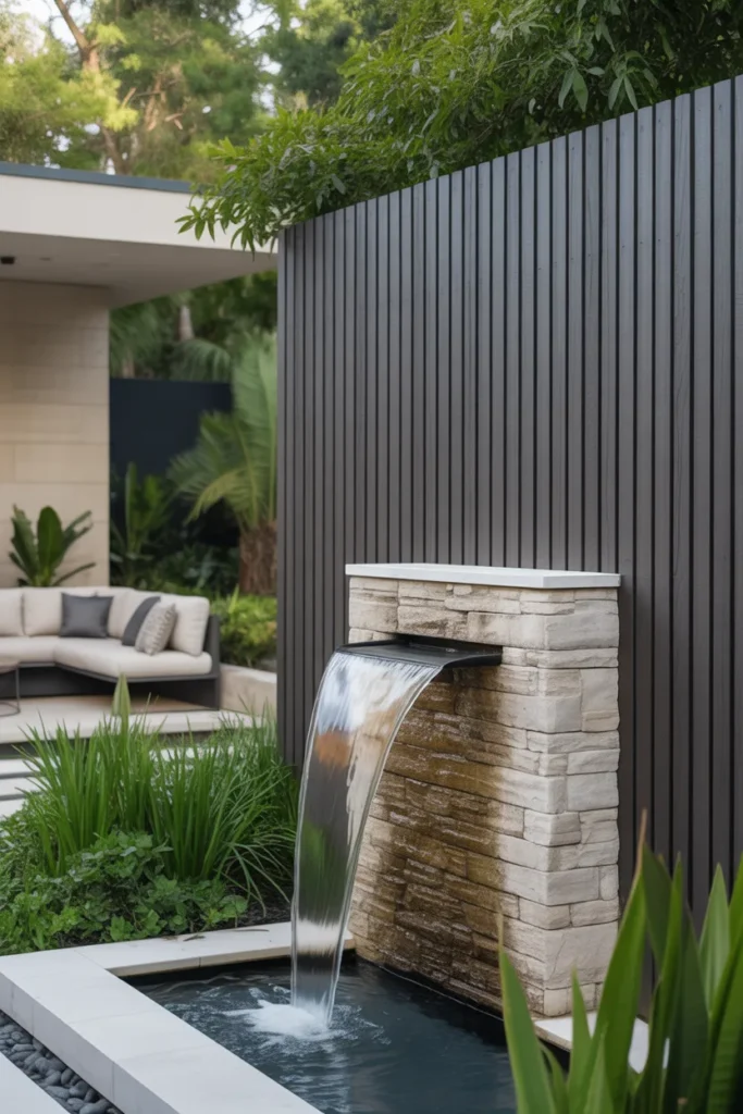 A fence combined with a water feature creates a peaceful backyard environment. The sound of flowing water adds relaxation while the wall structure provides privacy. This design often becomes the centerpiece of the outdoor space. Many homeowners love how it transforms the yard into a spa-like retreat.