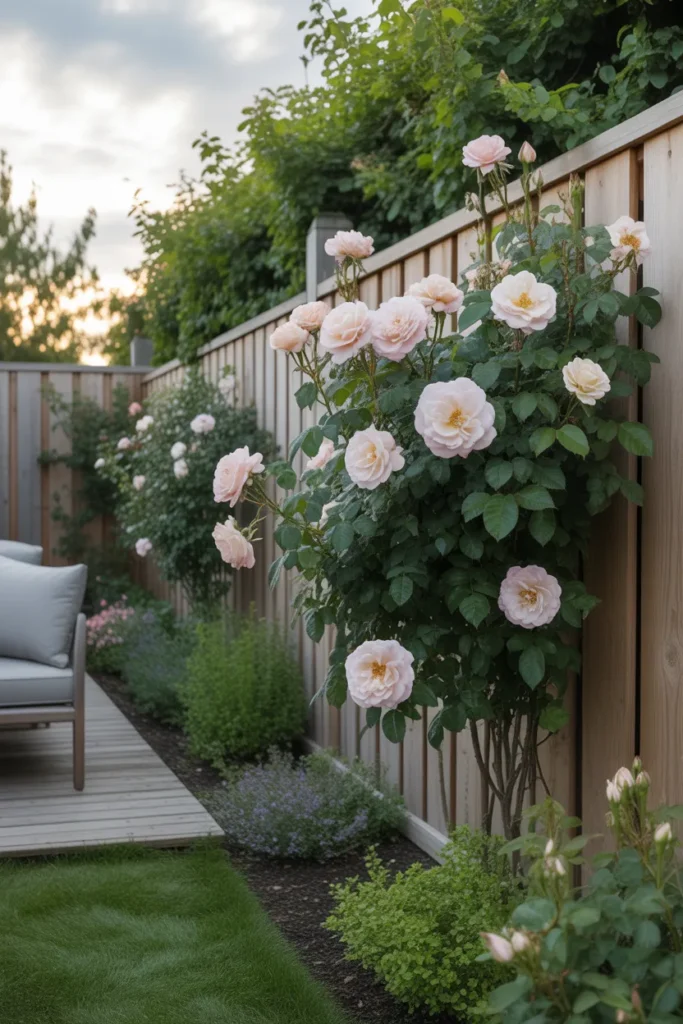 Climbing roses can turn a simple fence into a stunning garden feature. As the plants grow, they create a colorful and fragrant privacy wall. The flowers soften the structure and make the backyard feel more natural and inviting. This idea is perfect for anyone who loves a romantic garden atmosphere.