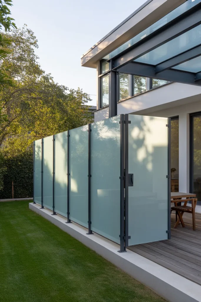 Frosted glass fences are becoming popular in luxury outdoor spaces. The panels allow light to pass through while still blocking visibility from neighbors. This creates a bright yet private backyard environment that feels open and elegant. The design works especially well for modern patios and pool areas.